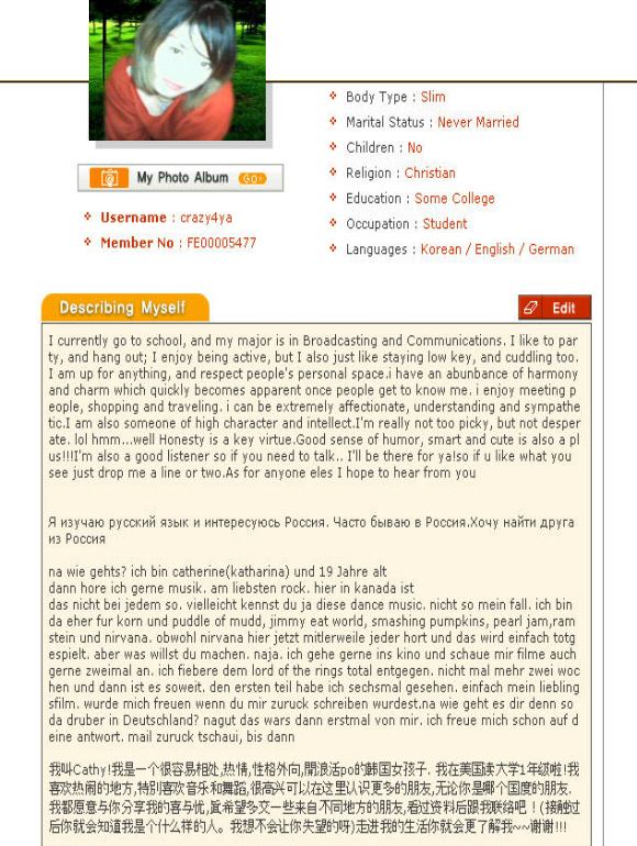 I study life,experiencing life and its mysteries gives me a greater sense of purpose.Exploring what the world has in store for my future and being able to grasp it and live it is one of my goals. Along with this is my most important goal, to find a right man,not any men, but a soulmate to be able to share life's experiences with, being able to share all of those intimate moments with as we grow together.not to 'have fun with' and am tired of the whole bar scene. The one I would like to date should also have a willingness to journey and explore life and its possibilities.who is honest,kind,ambitious,family-oriented,giving,high-spirited,has sence of humor and committed to love me.(all qualities I think I possess as well) It'd be great if he was willing to try all of the flavours of life. Also, even since I was a little girl by biggest goal in life was to get married and have kids.I guess the fact that my parents have such a wonderful relationship always amde me want to have that one day too.well I have to say surpriese,I guess surprise me with your charm,sensitivity,humor,everything be urself,dont be fake and dont lie to me. if he good cook, that would be awesome.